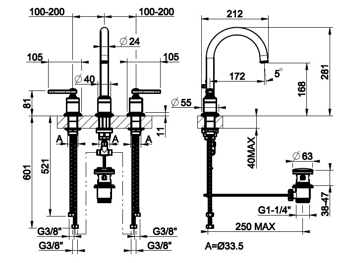 Gessi Venti20 Bateria umywalkowa 3-otworowa z korkiem średnia chrom 65015.031