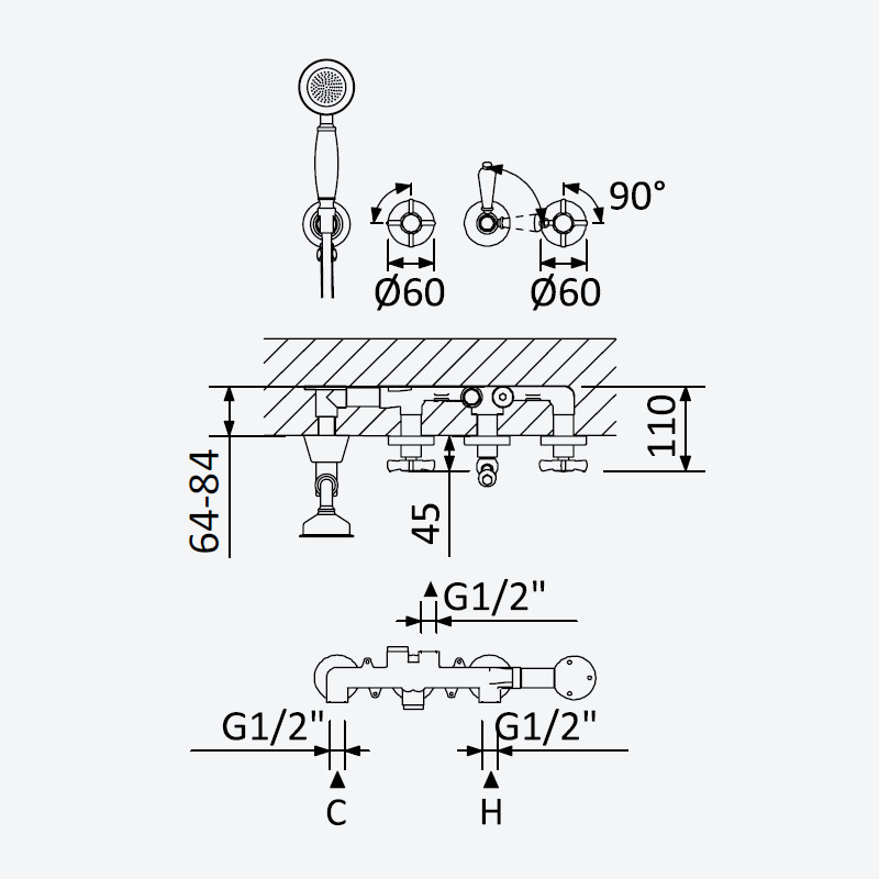 Bateria natryskowa podtynkowa 2-drożna, 3 otworowa