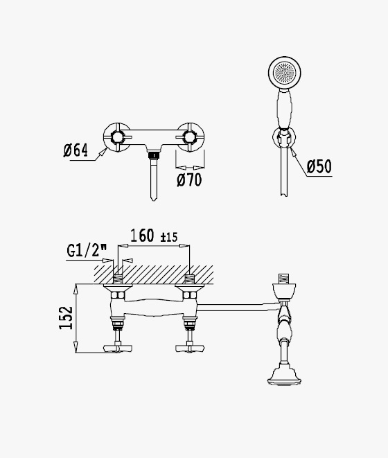 Bateria natryskowa ścienna ze słuchawką prysznicową i uchwytem ściennym