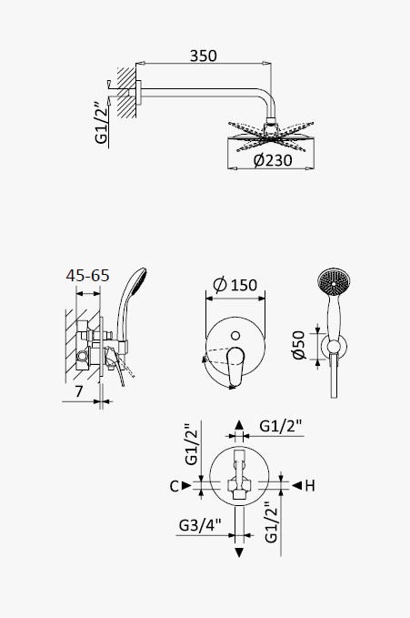 Bateria natryskowa podtynkowa z deszczownicą ścienną i słuchawką prysznicową z przyłączem i uchwytem