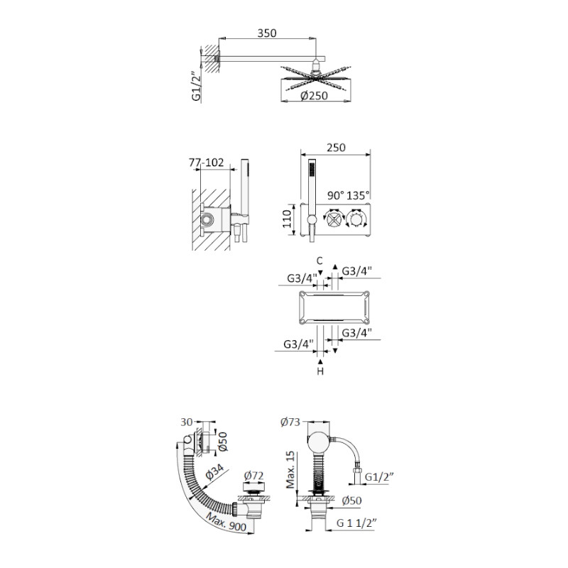 Bateria natryskowa podtynkowa termostatyczna, z deszczownicą ścienną, ze słuchawką prysznicową i przyłączem z uchwytem oraz z funkcją napełniania przez przelew