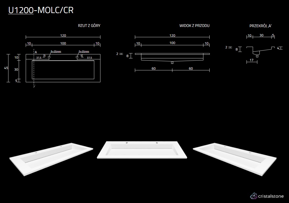 Cristalstone Linea Ideal Umywalka wpuszczana w blat Biały U1200-MOLC/CR