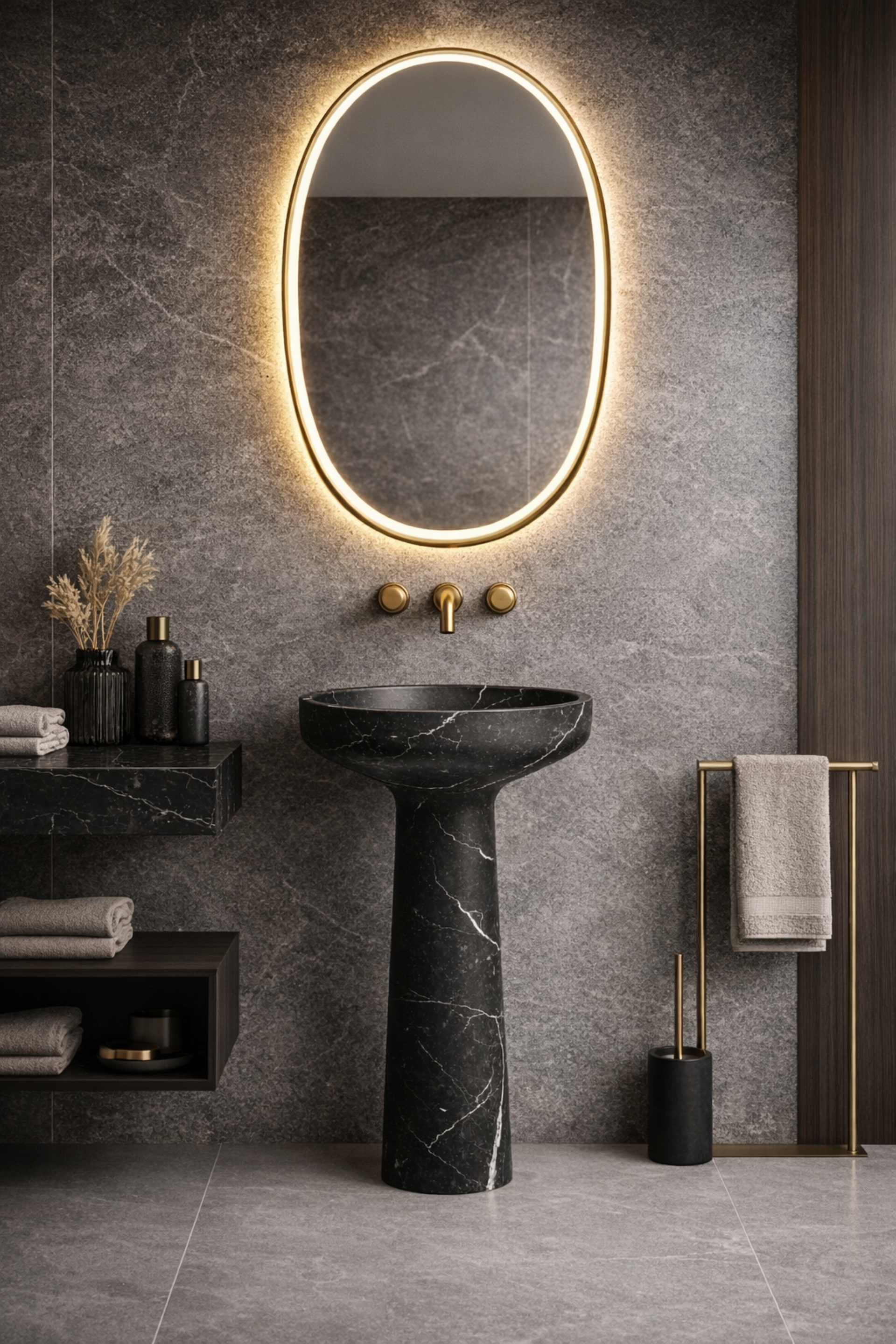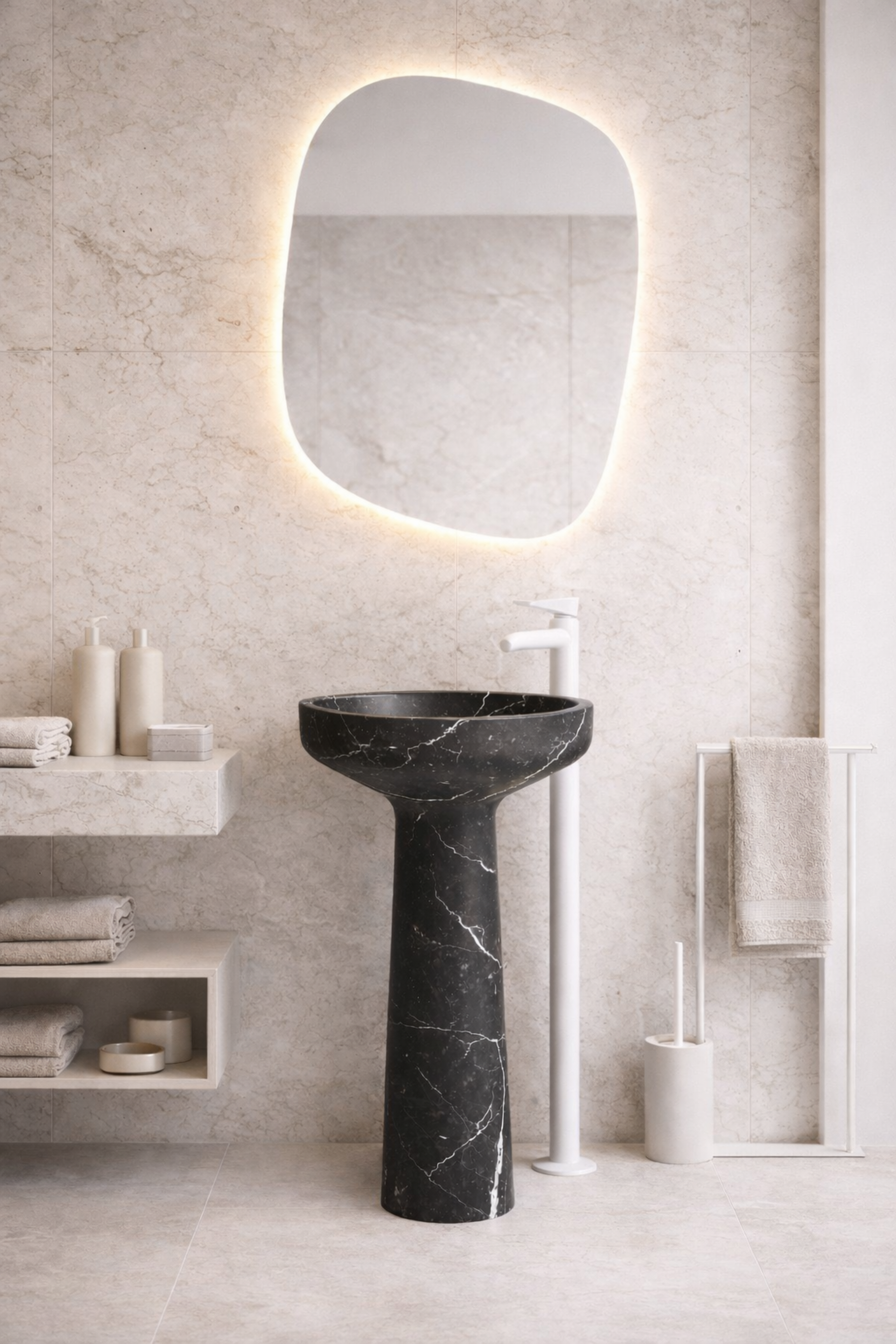 Umywalka wolnostojąca Antonio Lupi AGO185 to kwintesencja włoskiego wzornictwa i luksusu. Wykonana z naturalnego marmuru Nero Marquinia, zachwyca głęboką czernią przełamaną subtelnym, białym użyleniem, tworząc wyjątkowy element aranżacji nowoczesnej łazienki.