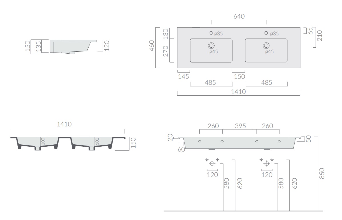 Galassia Eden Umywalka 2-komorowa z 2 otworami na baterię ścienna lub wpuszczana w blat 141x46 cm Biały 7228