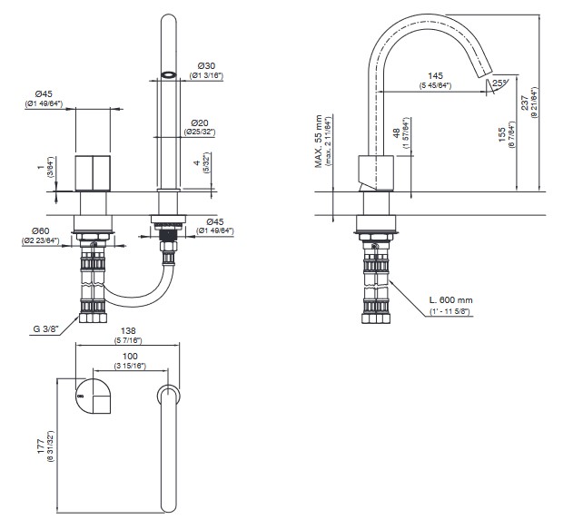CEA Duet Bateria umywalkowa 2-otworowa z obrotową wylewką Satin Stainless Steel DET11S