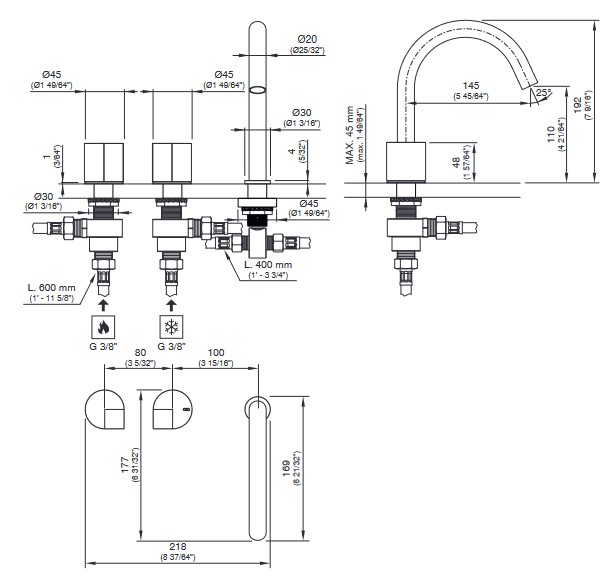CEA Duet Bateria umywalkowa 3-otworowa z obrotową wylewką Satin Stainless Steel DET12S