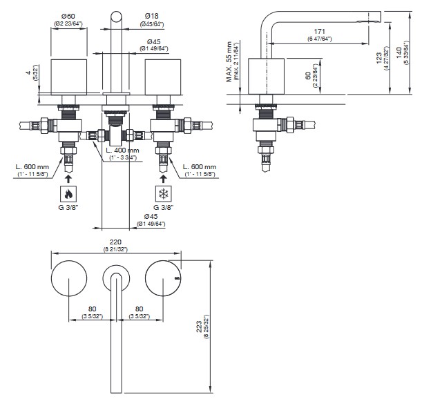 CEA Opus Bateria umywalkowa 3-otworowa z obrotową wylewką Satin Stainless Steel OPS03S