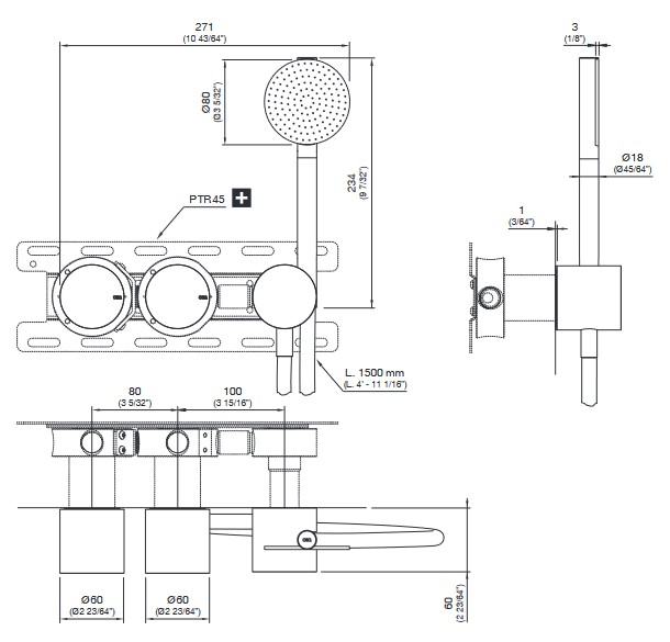 CEA Opus Bateria wannowa/prysznicowa ścienna ze słuchawką i wężem element zewnętrzny Satin Stainless Steel OPS24HWS