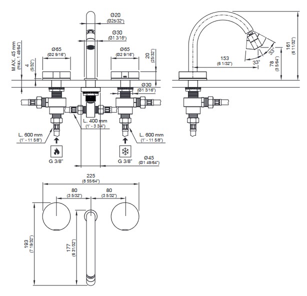 CEA Giotto Bateria bidetowa 3-otworowa z regulowaną wylewką Satin Stainless Steel GIO46S