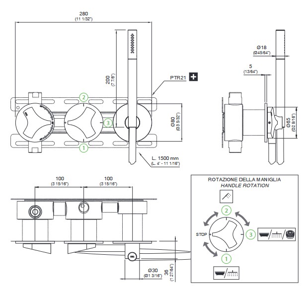 CEA Ziqq Bateria wannowa/prysznicowa ścienna termostatyczna z przełącznikiem 2/3-drożnym, słuchawką i wężem element zewnętrzny Satin Stainless Steel ZIQ71WS