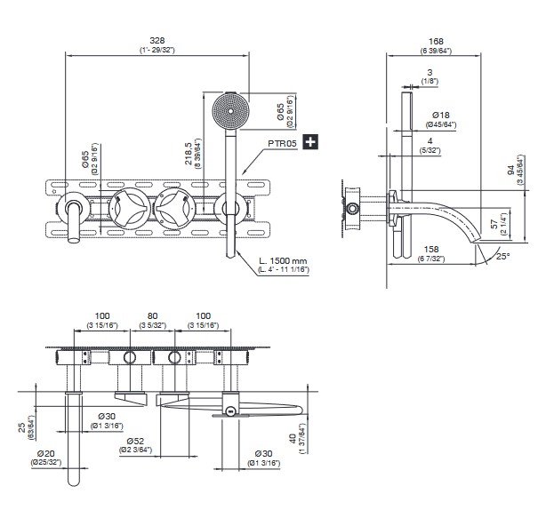 CEA Ziqq Bateria wannowa ścienna z wylewką, słuchawką i wężem element zewnętrzny Satin Stainless Steel ZIQ50YWS