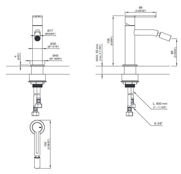 CEA Innovo Bateria bidetowa jednootworowa z regulowaną wylewką H15,5 cm Satin Stainless Steel INV02S