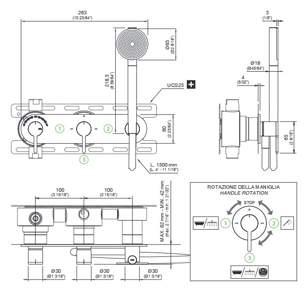 CEA Innovo Bateria wannowa/prysznicowa ścienna termostatyczna z przełącznikiem 2/3-drożnym, słuchawką i wężem element zewnętrzny Satin Stainless Steel INV59YWS