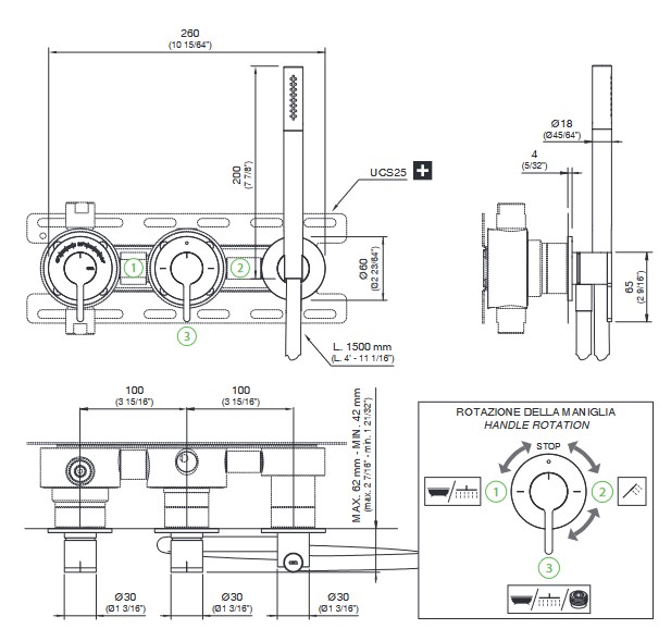 CEA Innovo Bateria wannowa/prysznicowa ścienna termostatyczna z przełącznikiem 2/3-drożnym, słuchawką i wężem element zewnętrzny Satin Stainless Steel INV60WS