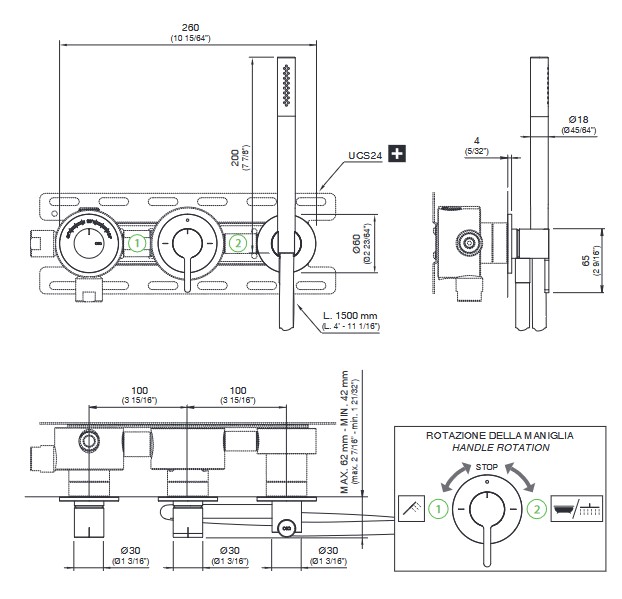 CEA Innovo Bateria wannowa/prysznicowa ścienna termostatyczna z przełącznikiem 2-drożnym, słuchawką i wężem element zewnętrzny Satin Stainless Steel INV51WS