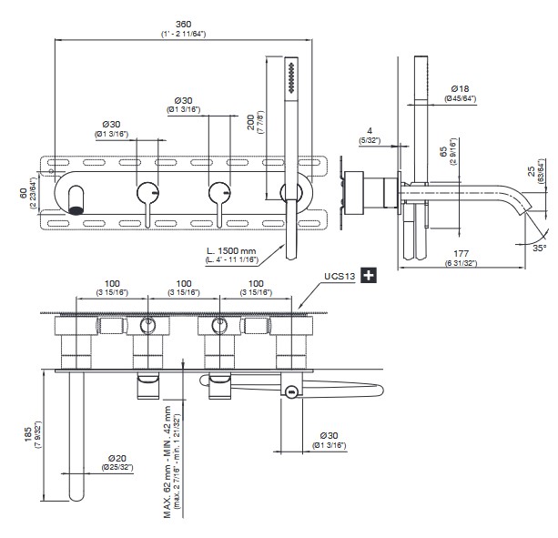 CEA Innovo Bateria wannowa ścienna z wylewką, słuchawką i wężem element zewnętrzny Satin Stainless Steel INV54WS