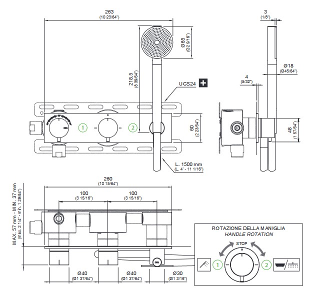 CEA Milo360 Bateria wannowa/prysznicowa ścienna termostatyczna z przełącznikiem 2-drożnym, słuchawką i wężem element zewnętrzny Satin Stainless Steel MIL25YWS