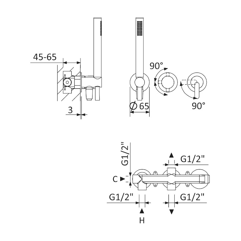 Bateria 3-otworowa ze słuchawką, mieszaczem i przełącznikiem.