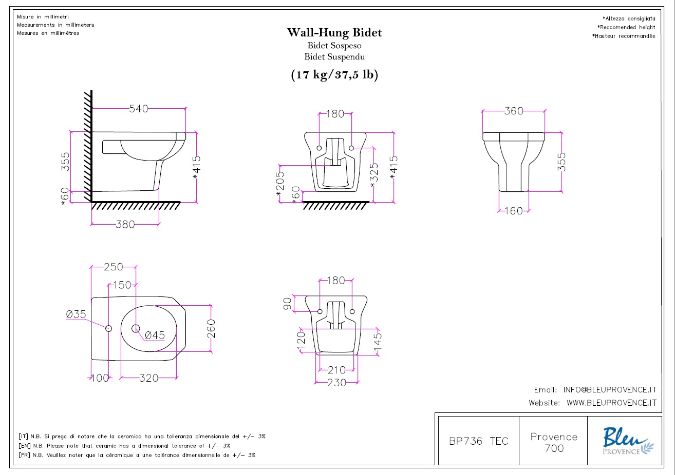 Bleu Provence Bidet wiszący 36x54 white BP736