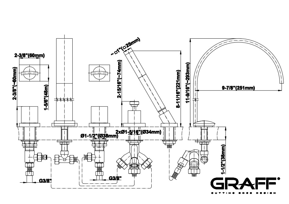 Graff Sade Bateria wannowa 5-otorowa z zestawem natryskowym Chrom E-1856-C14B