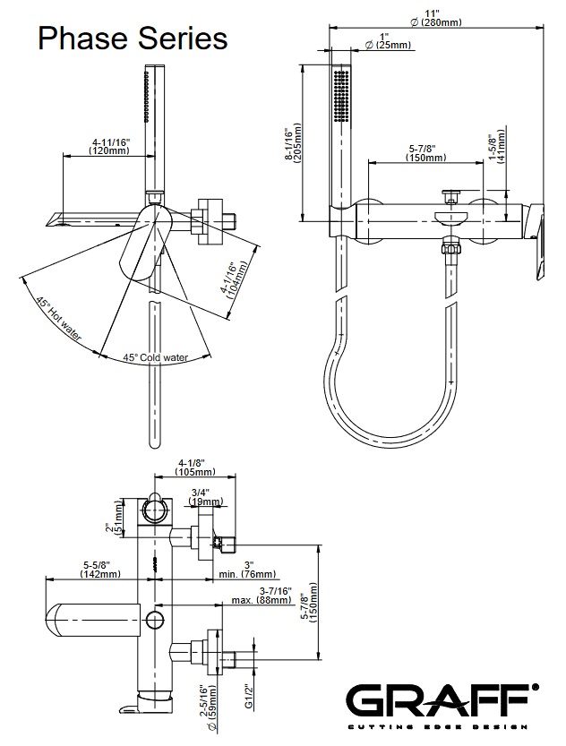 Graff Phase Bateria wannowo-natryskowa ścienna z zestawem prysznicowym Chrom EX-6676-LM45W