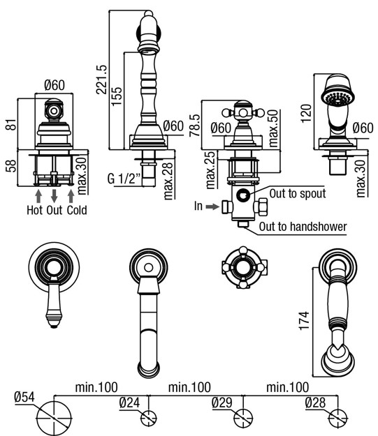 Alpi London Bateria wannowa na brzeg wanny 4-otworowa chrom LOM27D30930CR