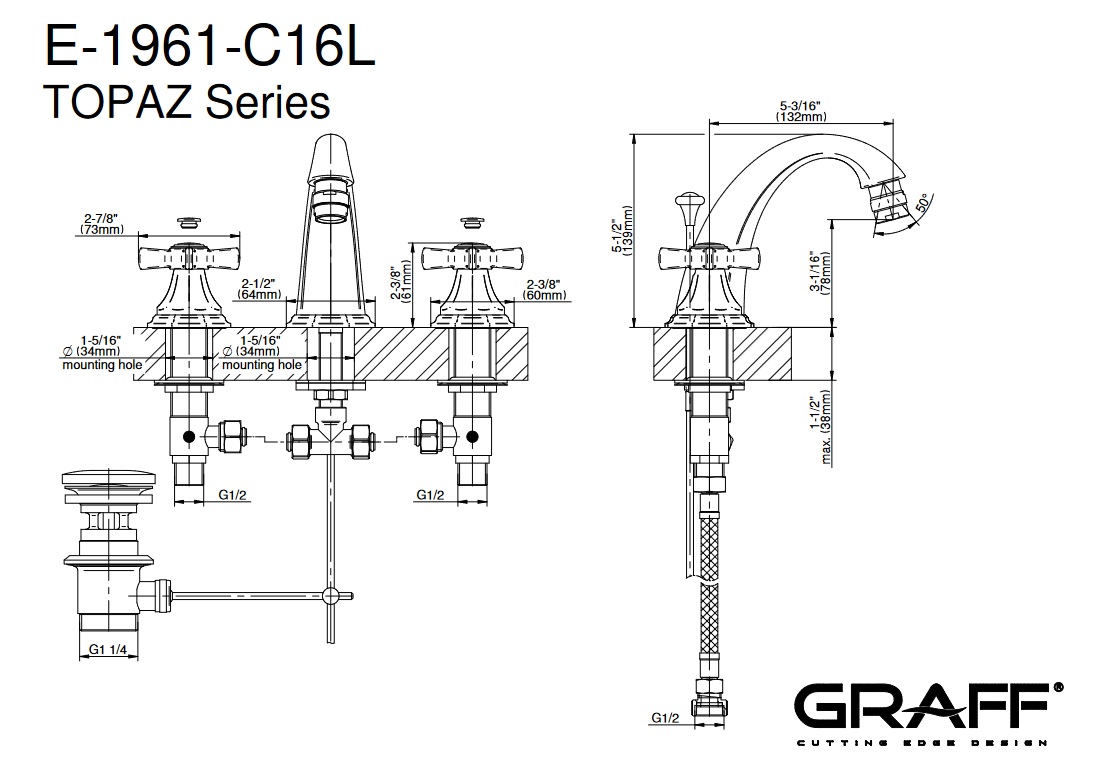 Graff Topaz Bateria bidetowa 3-otworowa z korkiem Chrom E-1961-C16L
