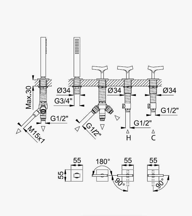 Bruma Royale Bateria wannowa na brzeg wanny z zestawem natryskowym Gunmetal 1925011MG