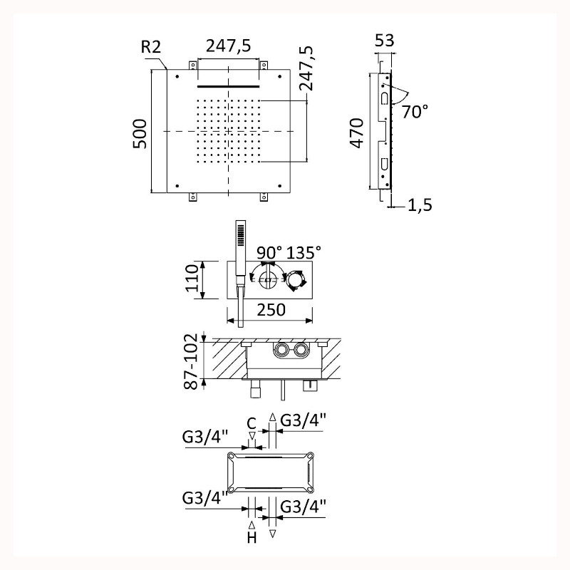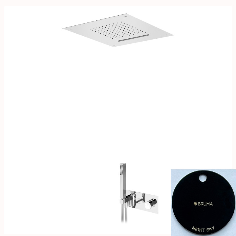 Bruma Royale Zestaw termostatyczny natryskowy podtynkowy z deszczownicą montowaną w sufit ze strumieniem kaskadowym 500x500 mm i słuchawką prysznicową Night Sky 1927881NS