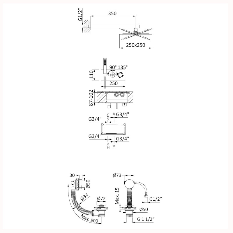 Bateria termostatyczna wannowo-natryskowa podtynkowa z deszczownicą ścienną oraz zestawem: słuchawka prysznicowa, wąż, przyłącze z uchwytem na słuchawkę