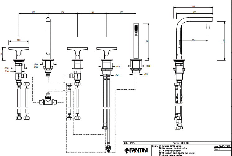 Fantini Sailing Bateria wannowa na brzeg wanny 5-otworowa matt gunmetal pvd 67P5J065