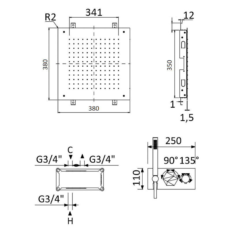 Bruma Utopia Zestaw natryskowy termostatyczny podtynkowy z deszczownicą 380x380 mm sufitową i słuchawką Night Sky 1837861NS