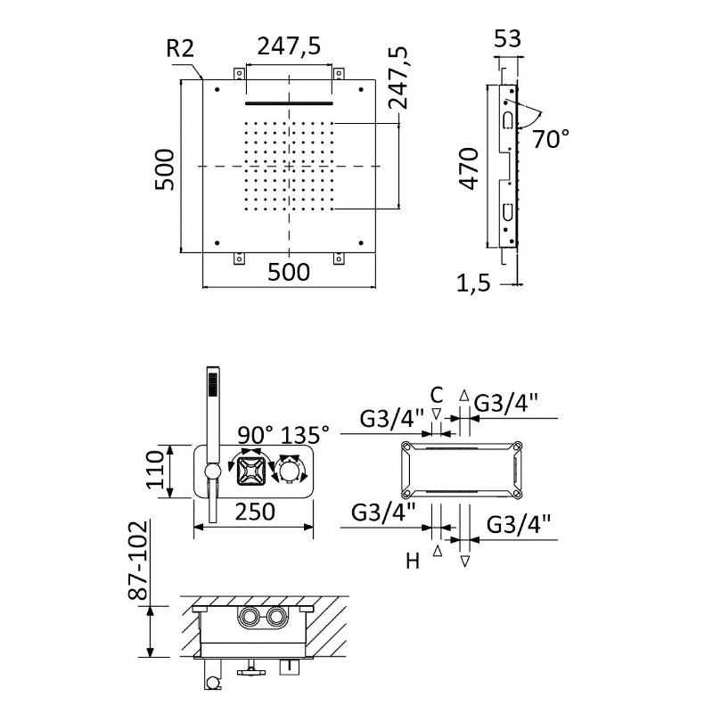 Bruma Navy Zestaw natryskowy termostatyczny z deszczownicą sufitową 500x500 mm ze strumieniem kaskadowym i słuchawką prysznicową Morning Mist 1907881MM