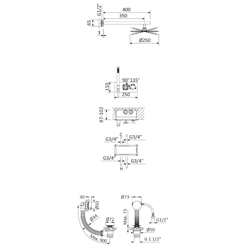 Długość odpływu: max 900 mm