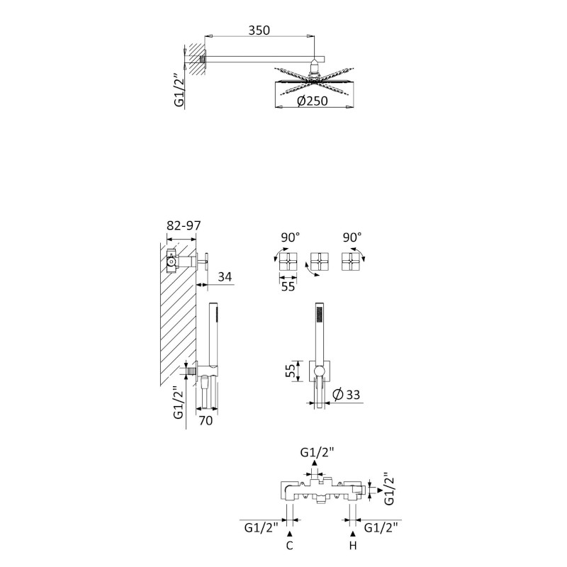 Bateria natryskowa podtynkowa z deszczownicą ścienną, ze słuchawką i uchwytem z przyłączem