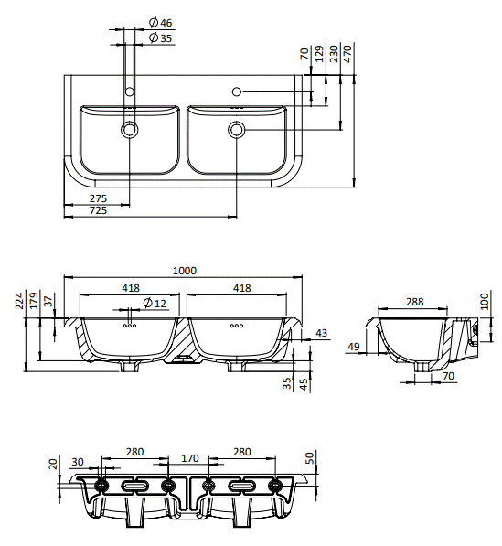 Burlington Umywalka podwójna 100x47 biały połysk CH1001SCW