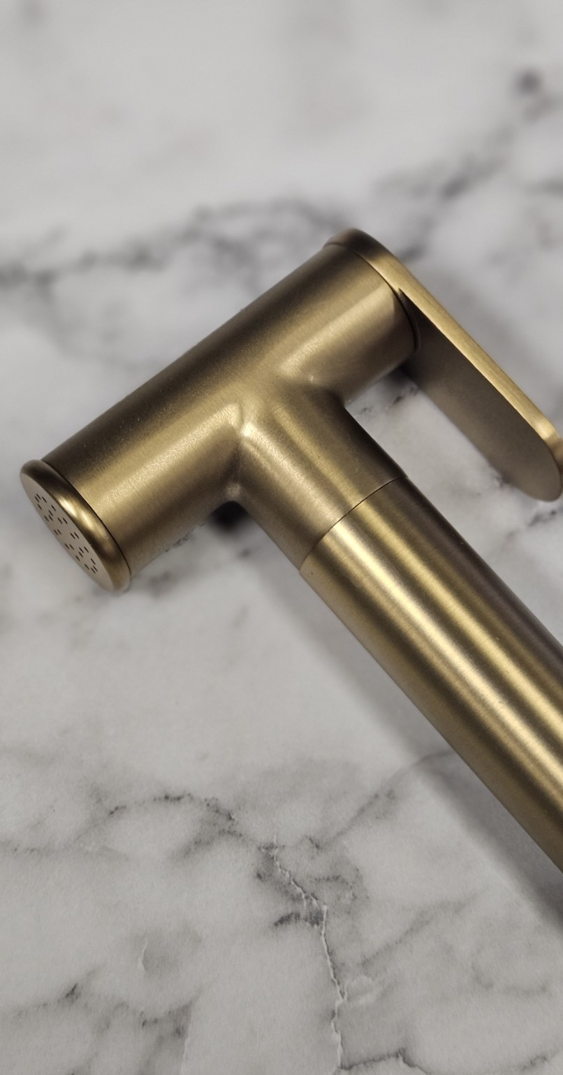 Metalowa rączka bidetowa w eleganckim kolorze Sunrise – nowoczesne wykończenie i trwałość w kompaktowej formie. Idealna do zestawienia z armaturą w ciepłych tonacjach.
