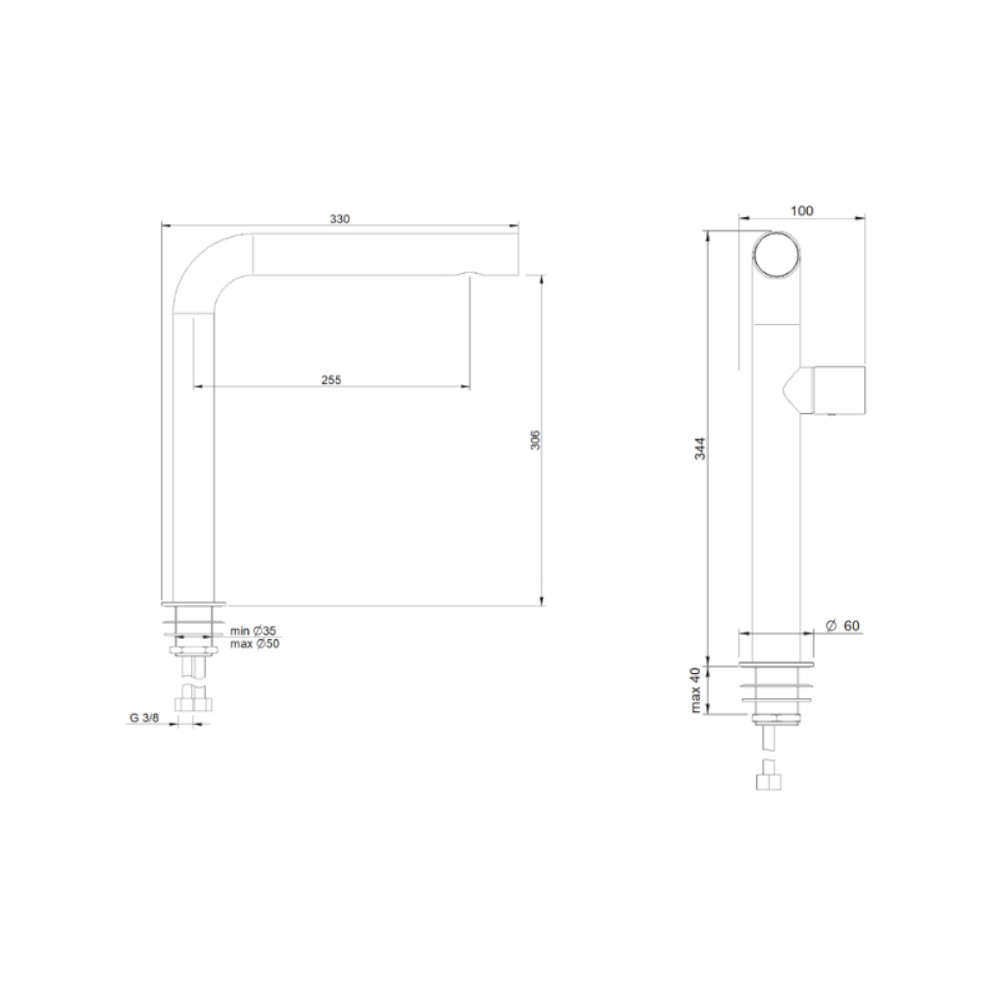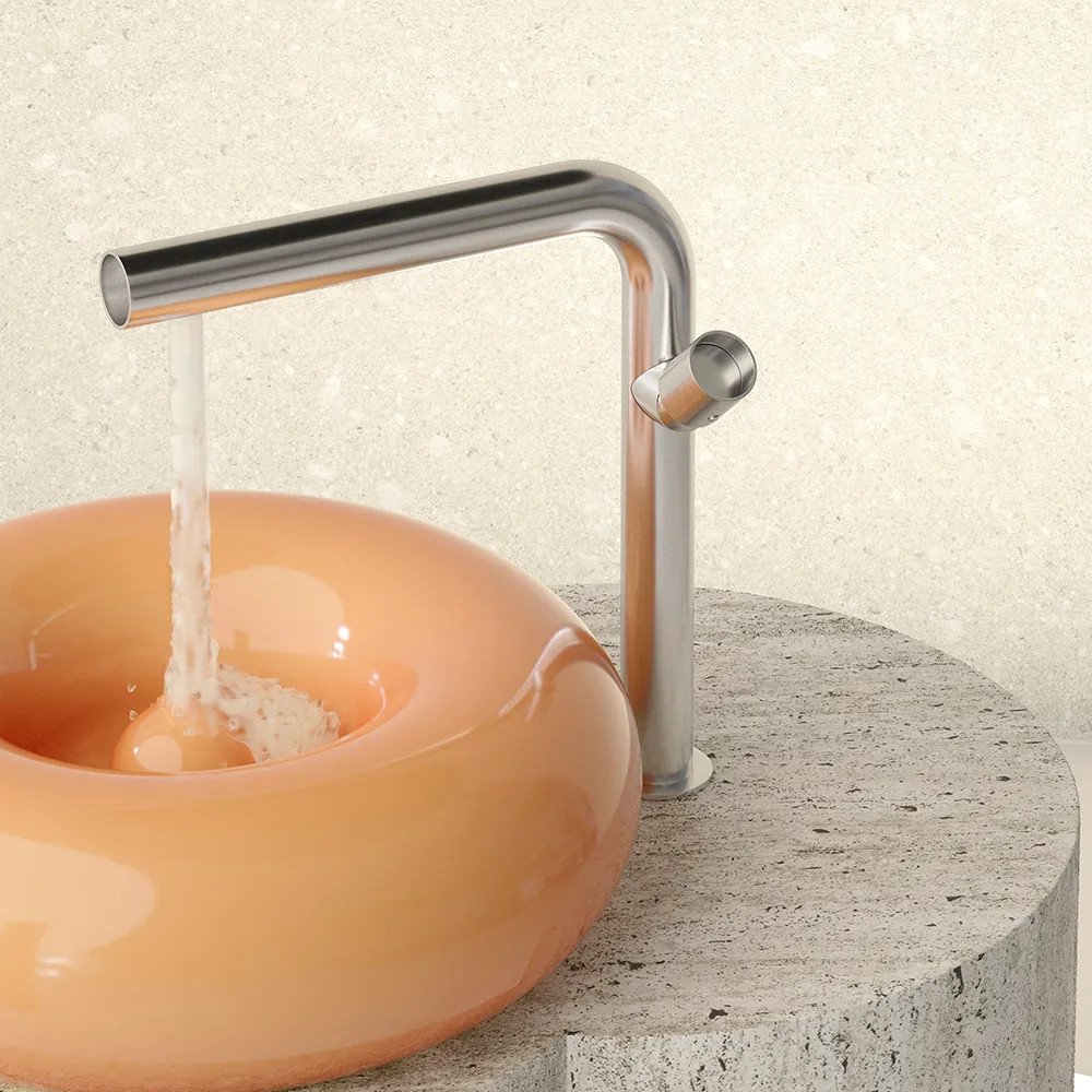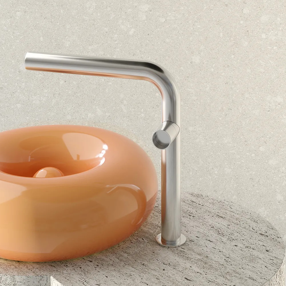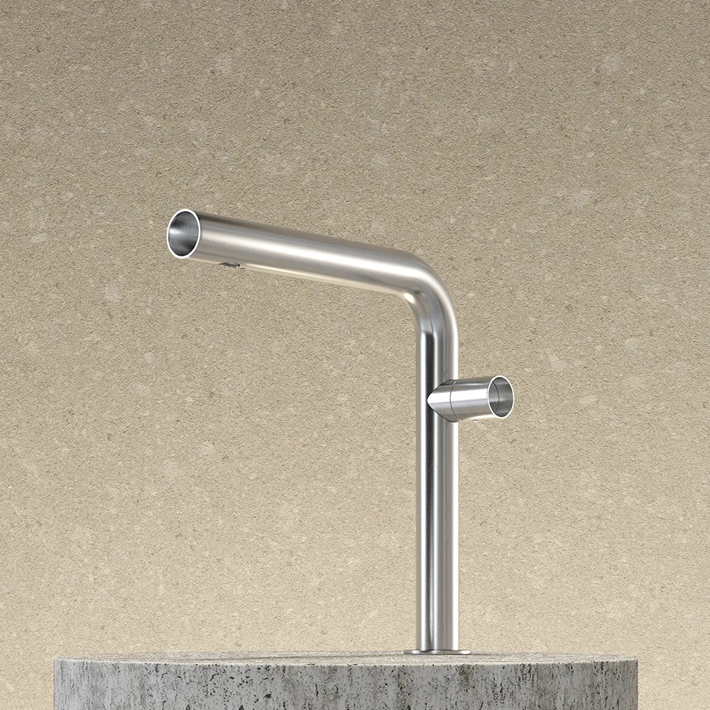Odważnie zaprojektowana bateria umywalkowa nablatowa, łącząca industrialną estetykę z nowoczesną funkcjonalnością.Wymiary: