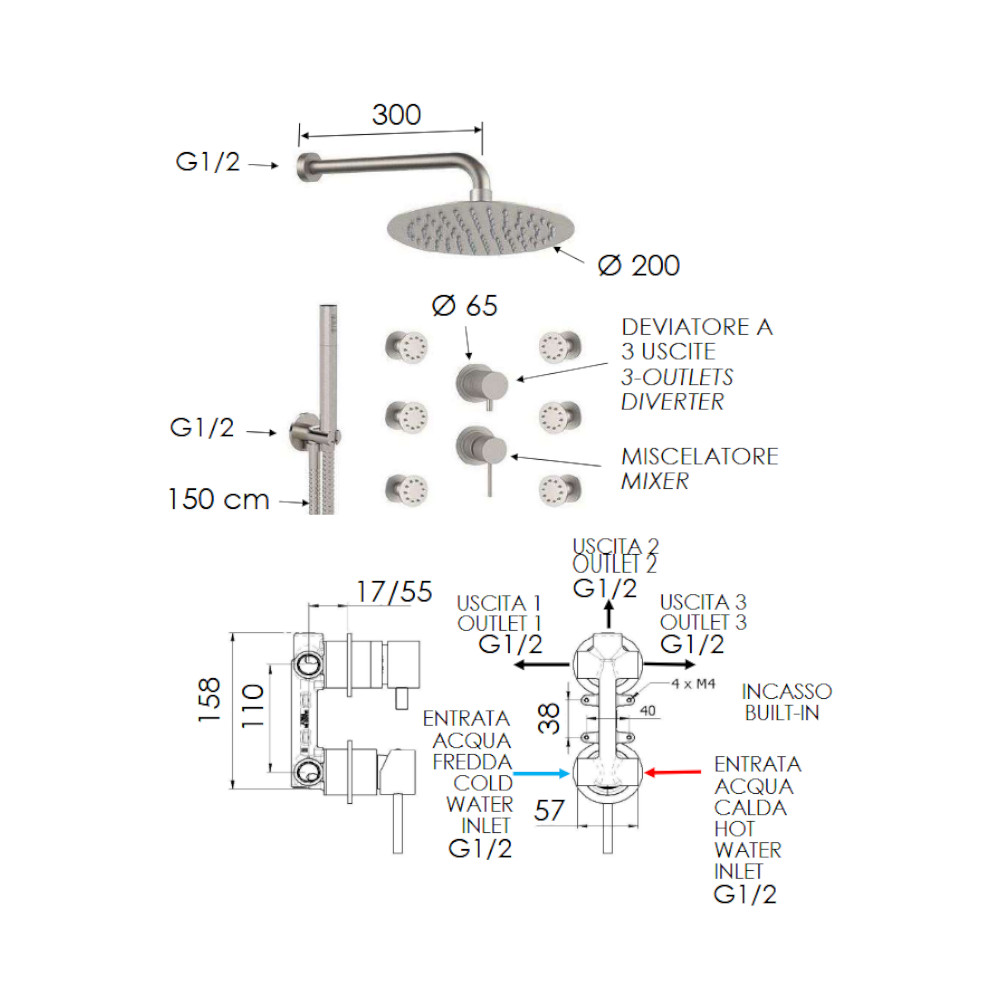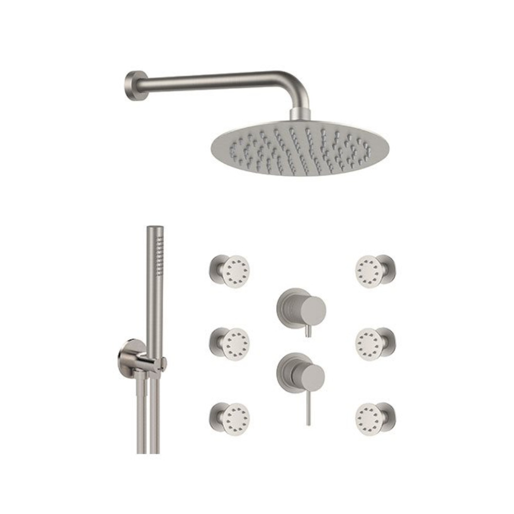 Remer X Style Inox Zestaw natryskowy termostatyczny z deszczownicą Ø 200 mm, z 6 dyszami bocznymi oraz przyłączem i uchwytem Inox SSX93PS02UFM20