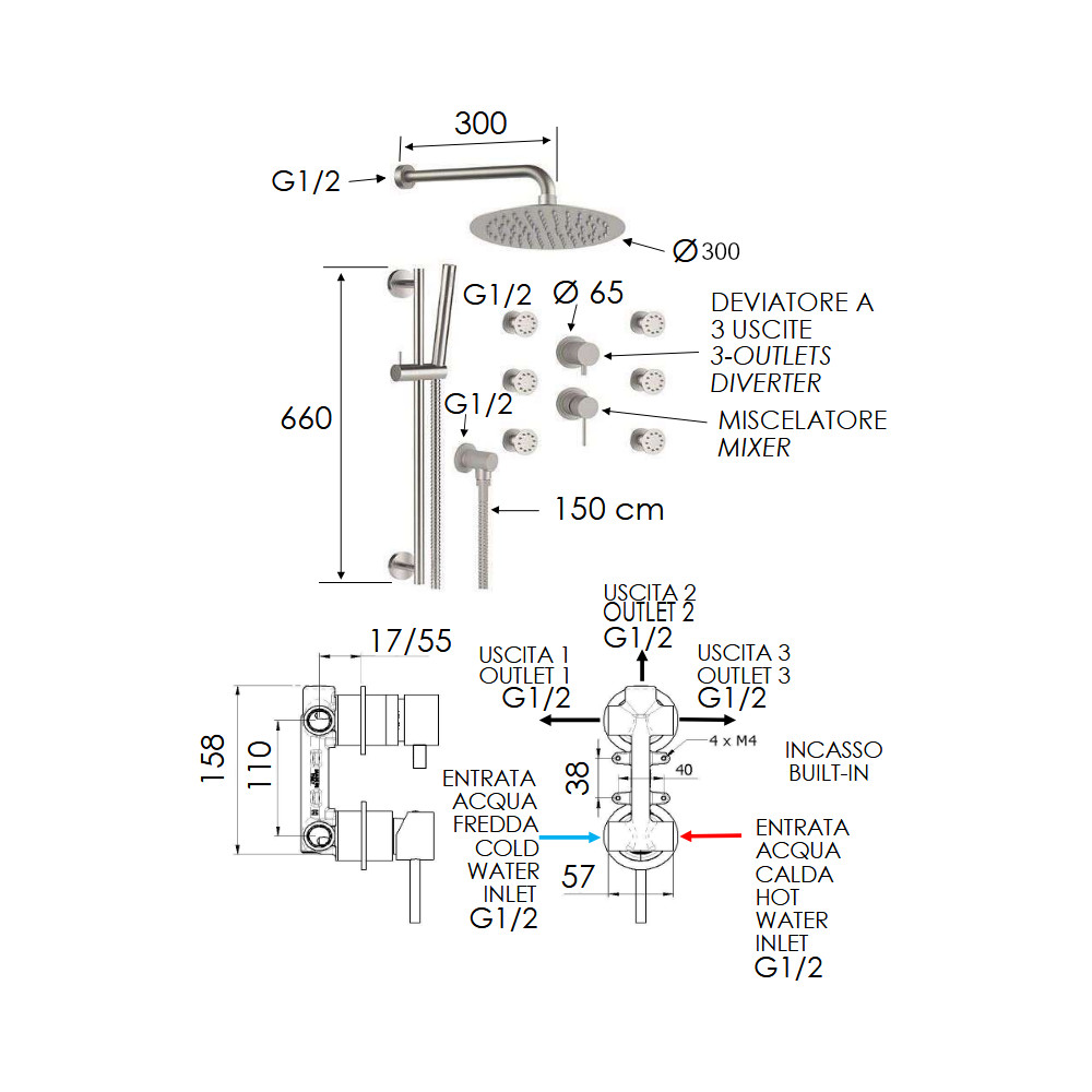 Remer X Style Inox Zestaw natryskowy termostatyczny z deszczownicą Ø 300 mm, z przyłączem oraz uchwytem na drążku i 6 dyszami Inox SSX93PS01UFM30