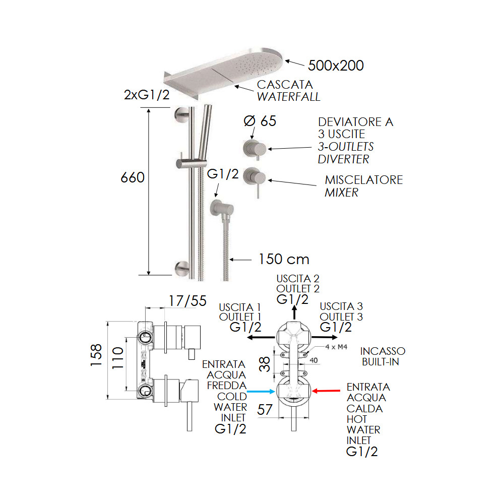 Remer X Style Inox Bateria natryskowa deszczownicą ścienną i zestawem natryskowym na drążku Inox SSX93PS01MMCA