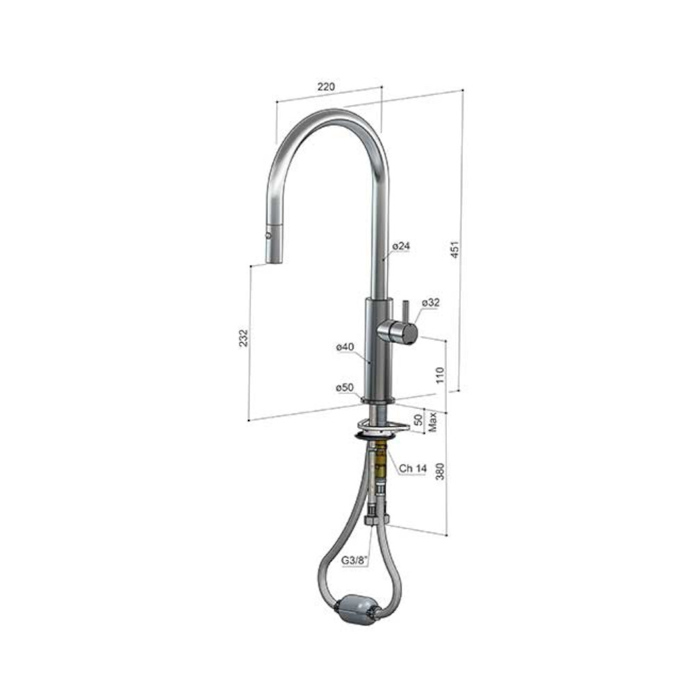 Wysięg wylewki: 220 mm