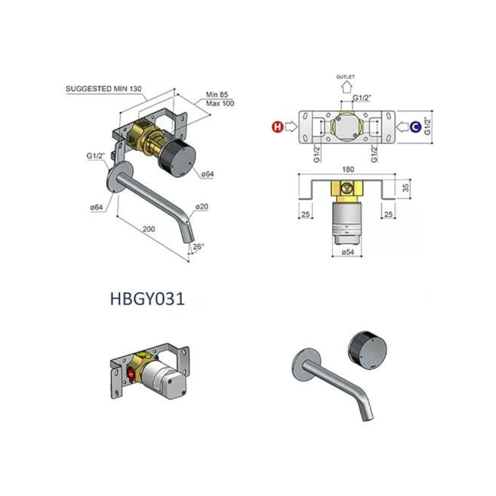 Hotbath Guy Row Bateria umywalkowa podtynkowa 200 mm - element zewnętrzny Matt Black PVD GY005R-20.MBP