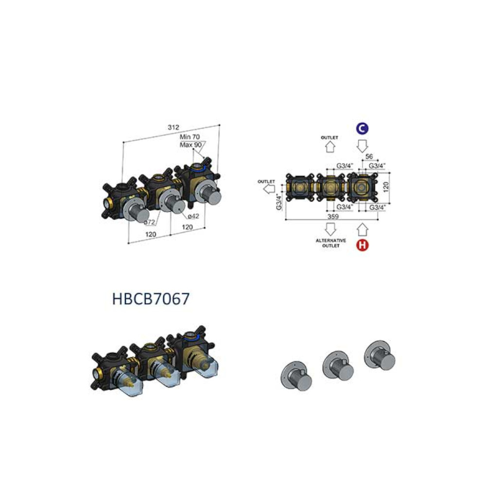 Hotbath Guy Diamond Bateria natryskowa termostatyczna podtynkowa 2-drożna 3-uchwytowa - element zewnętrzny Brushed Brass PVD GY7067D.BBP