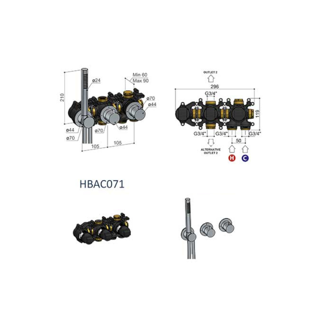 Bateria termostatyczna z mieszaczem i dwoma zaworami
