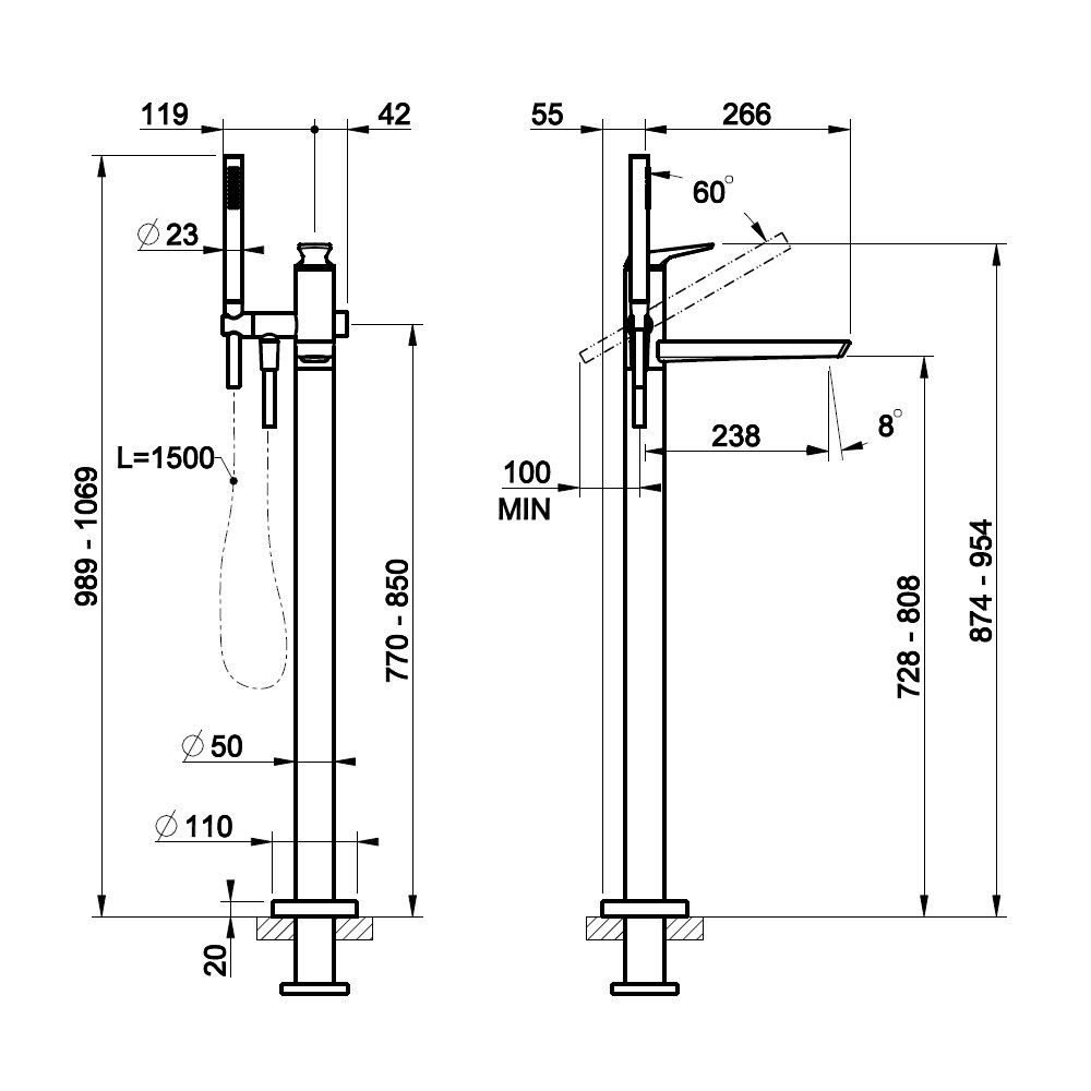 Wysokość wylewki: 728 - 808 mm
