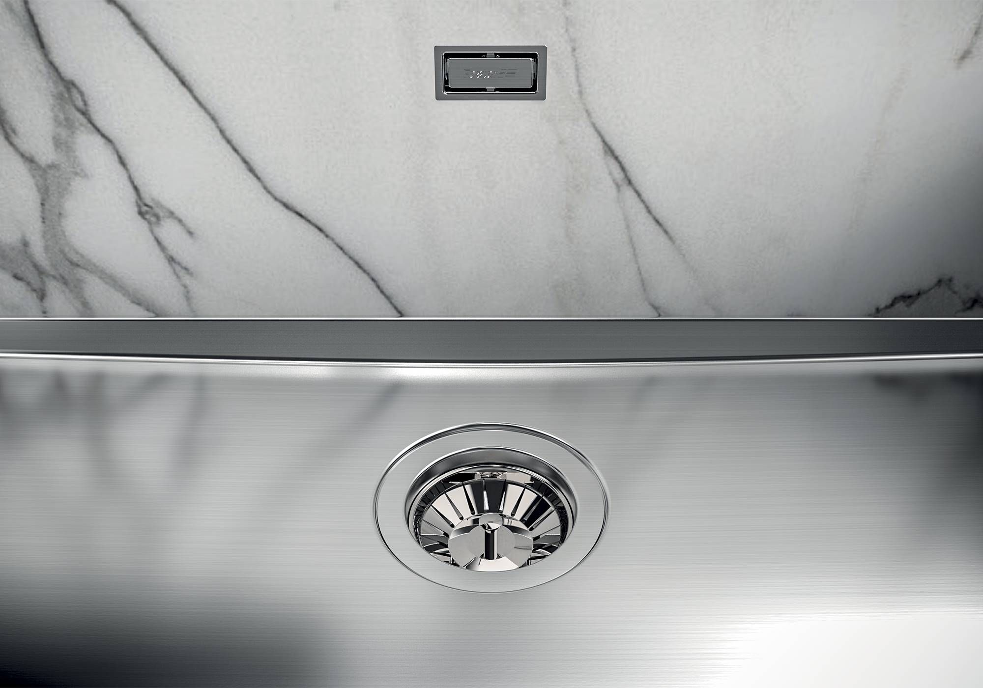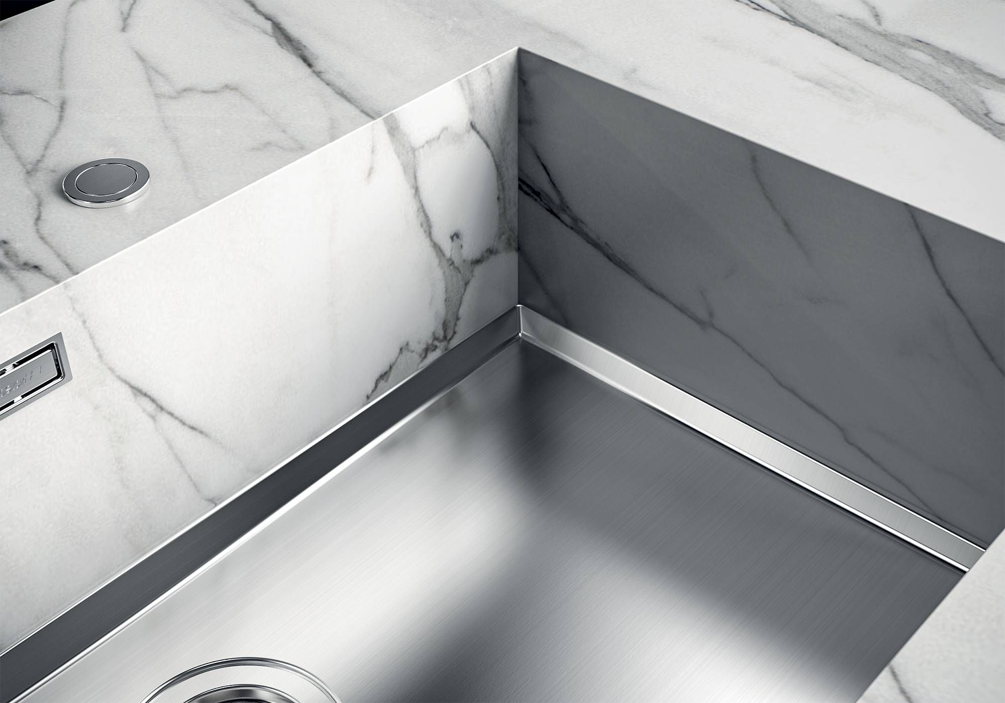Dzięki takiemu połączeniu granice między zlewem a blatem zostają maksymalnie zredukowane, a całość sprawia wrażenie jednolitej powierzchni. Widoczne pozostaje jedynie stalowe dno, co nadaje całości wyjątkowo minimalistyczny, czysty i nowoczesny charakter.