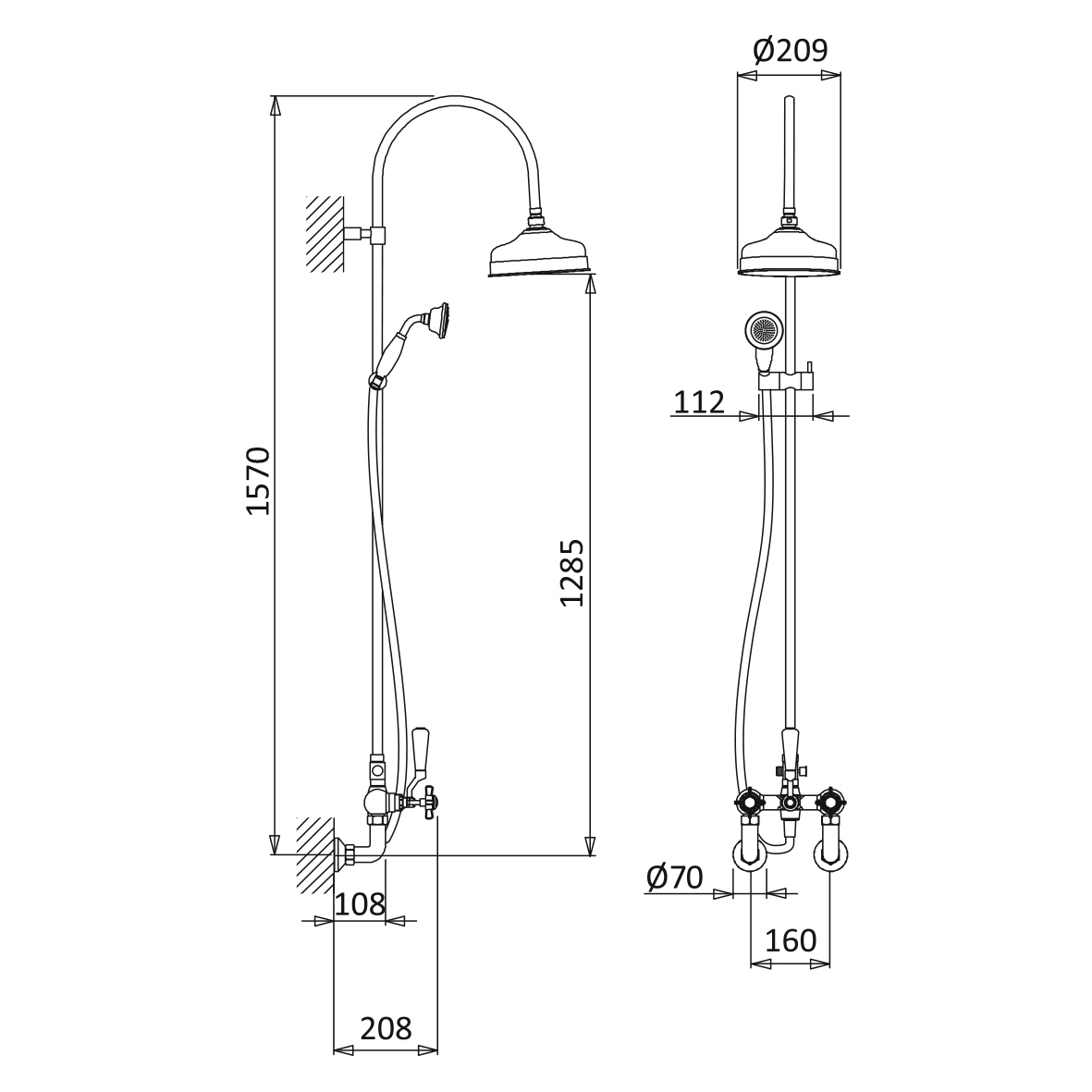 Zestaw natryskowy z deszczownicą, ramieniem, baterią i słuchawką.