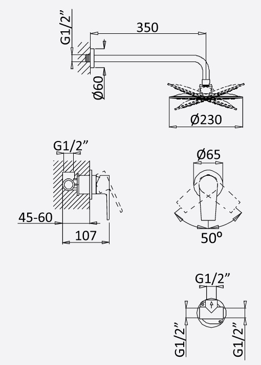 Zestaw składający się z mieszacza, deszczownicy i ramienia.