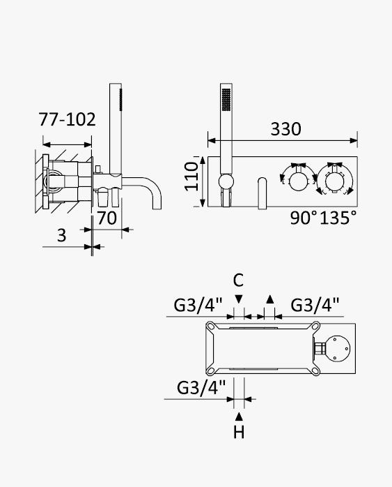 Bateria podtynkowa 3-drożna ze słuchawką, wężem i elementem montażowym podtynkowym w komplecie